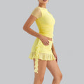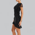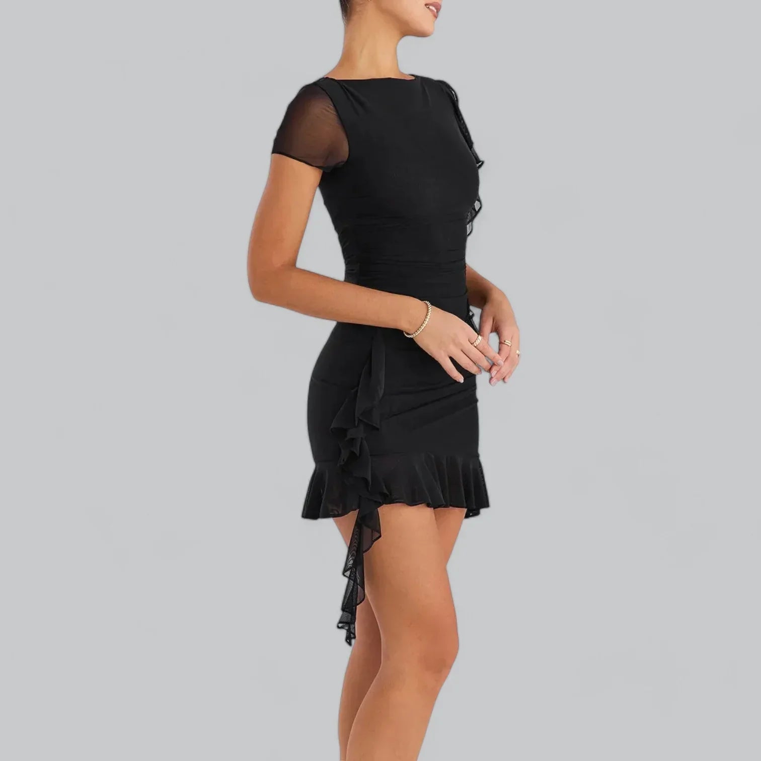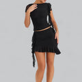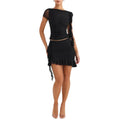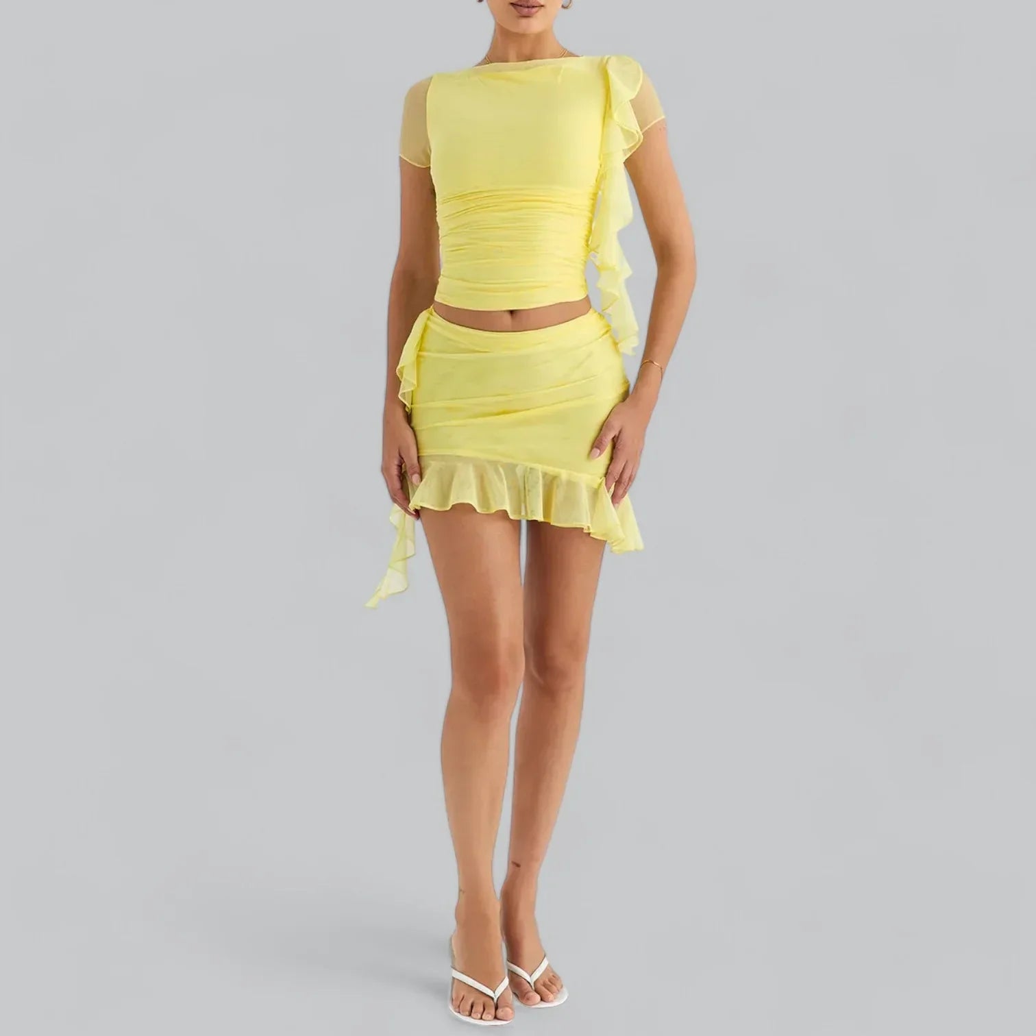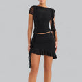De Ferelith set bestaat uit een tweedelig mini-model met fijne ruffle-details voor een uitgesproken avondlook. De stof heeft stretch voor comfortabel dragen en blijft bij normaal gebruik goed aansluiten. Geschikt voor gelegenheden zoals diners, feestjes of een avond uit.